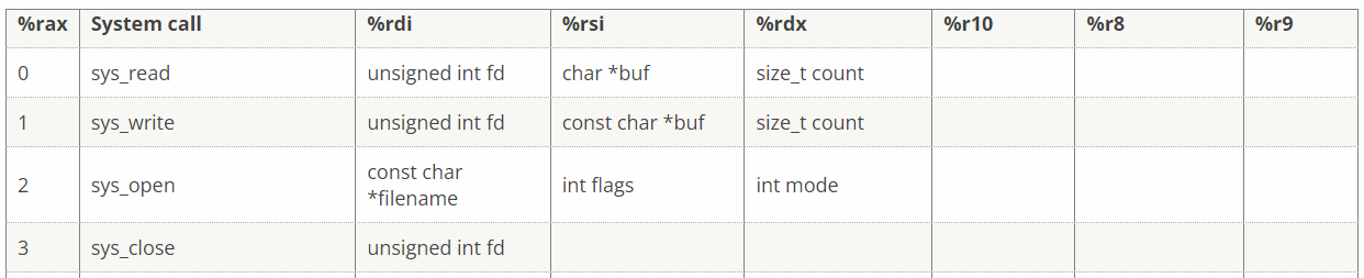 사실 구글에 "64bit system call table"만 검색해도 쉽게 찾을 수 있으며 본 문제에서 필요한 open, read, write 함수는 아래와 같이 잘 정리되어있다.
